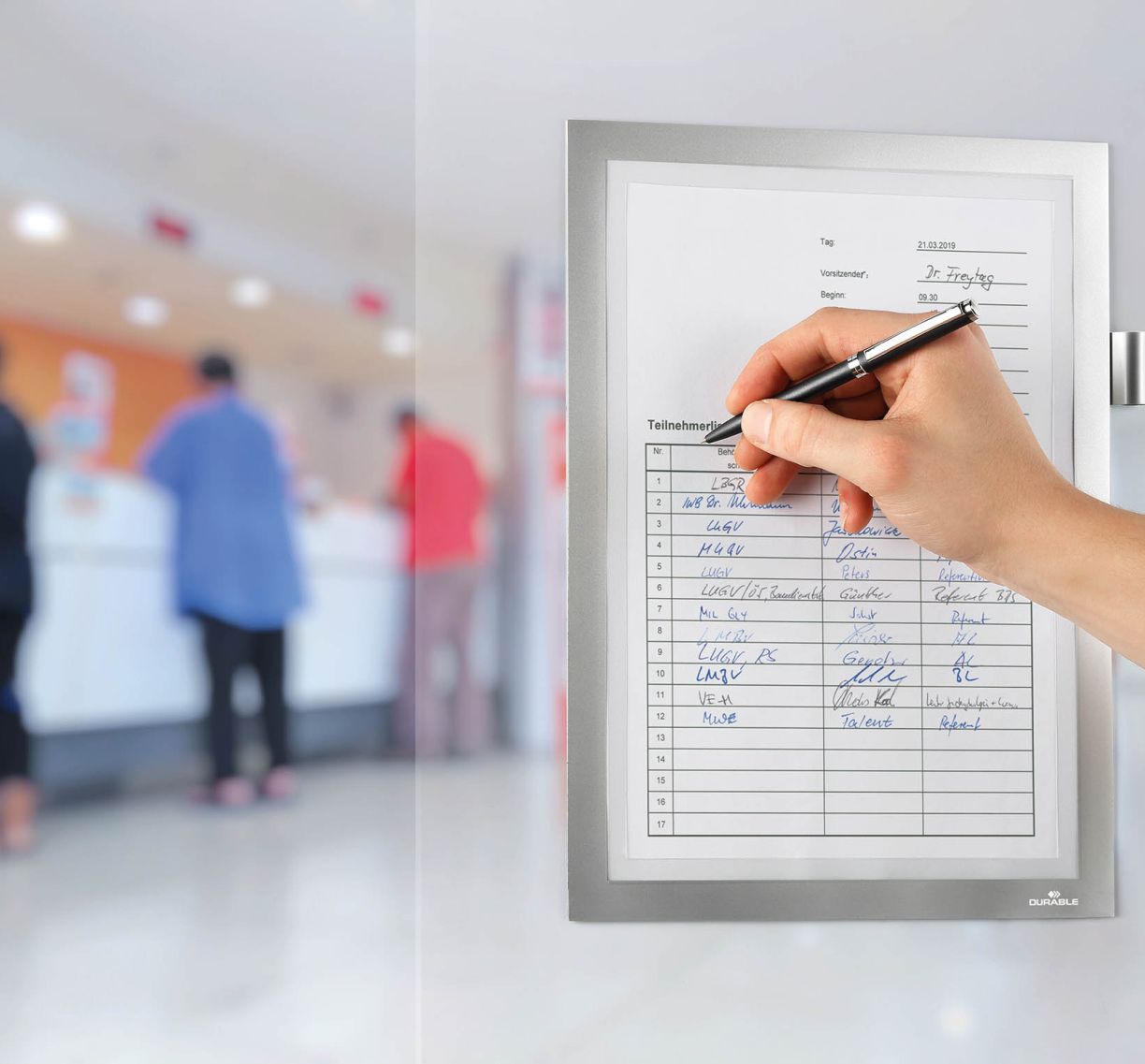 A DURAFRAME® NOTE infokeret elegáns megoldást nyújt információk gyors és professzionális megjelenítéséhez. Könnyen felhelyezhető sima felületekre. Ideális rendezvények regisztrációs lapjaihoz, mosdók takarítási ütemterveihez vagy karbantartási ellenőrzések dokumentálásához.